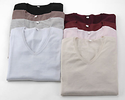 | カシミヤファインゲージ 天竺Vネックセーター | ベージュ、ラベンダー、ライトグリーン、ライトグレー、 茶、エンジ、ボルドー、黒 | 婦人 S・M・L | 9,345円 |