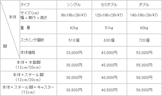 ポケットコイル脚付マットレス一覧表(組み合わせ価格)