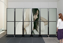 『トールビジョン』は複数の大型ディスプレーをつなげ、あたかも1つのディスプレーのようにデジタル映像を表示するデジタルサイネージシステムです。無印良品池袋西武では、道路に面した1階ショーウィンドウに42インチの液晶ディスプレーを縦置きで縦方向に2段、横方向に6列配置し、通行する人びとを店内に誘導するよう、12面を効果的に活用して映像を表示します。また、エスカレーター脇に46インチの液晶ディスプレーを横置きで縦方向に2段、横方向に2列配置し、エスカレーターを利用中のお客様をはじめ店内でお買い物をされているお客様に情報を提供いたします。