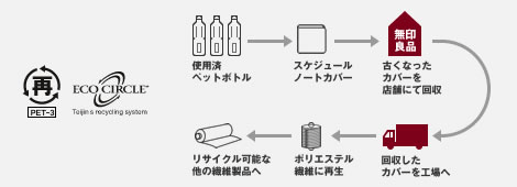 株式会社良品計画(東京都豊島区/代表取締役社長 金井政明)は、帝人グループ(以下、テイジン)でポリエステル繊維事業を展開している帝人ファイバー株式会社(大阪府大阪市/代表取締役社長 亀井範雄)と共同で布製のカバーをリサイクルできるスケジュールノートを2009年10月15日より展開いたします。販売後、カバーが不要になった時点で、無印良品の店頭にてポリカーボネイト軸中性(ゲルインキ)ボールペン(税込価格100円)と引き替えに回収いたします。回収された商品は帝人ファイバーが展開する循環型リサイクルシステム「エコサークル®」によってポリエステル原料に再生されます。