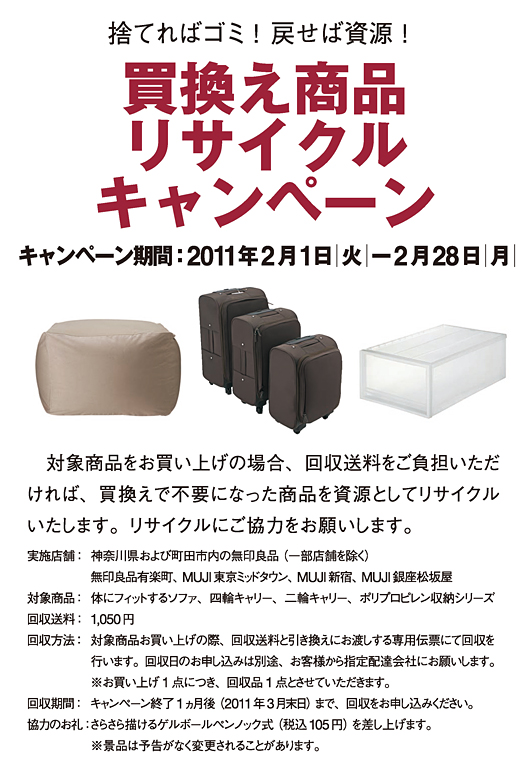 無印良品を展開する株式会社良品計画(東京都豊島区/代表取締役社長 金井政明)は、日本環境設計株式会社(東京都渋谷区/代表取締役社長 岩元 美智彦)の子会社であるモバイルリサイクリング株式会社と共同で、2月1日~2月28日の1ヶ月間、都内旗艦店、神奈川県内、町田市内の無印良品直営店で体にフィットするソファ等の人気商品3品種をお買い上げのお客様から買換えにより不要になる商品を回収し、リサイクルするキャンペーンを実施します。なお、このキャンペーンは2010年8月に実施したプラスチック回収リサイクル実験の第2弾としての位置づけです。