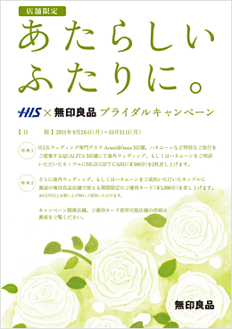 株式会社良品計画(本社 東京都豊島区/代表取締役社長 金井政明)は、株式会社エイチ・アイ・エス(本社 東京都新宿区/代表取締役社長 平林朗 以下H.I.S.)とのコラボレーション企画として、2011年9月26日から10月31日までの期間、H.I.S.の対象店舗にて海外ウエディングやハネムーンをご相談・ご予約されたお客様を対象に、無印良品の店舗でご利用いただけるMUJI GIFT CARDやご優待カードを贈呈するブライダルキャンペーンを開催します。
