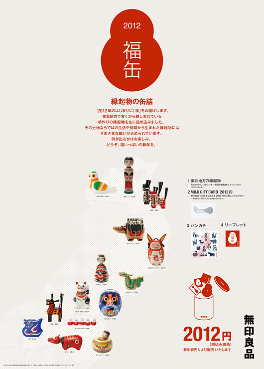 東北4県の13の手づくりの縁起物いずれか1点とオリジナルハンカチ、MUJI Gift Card(2,012円分)等を缶に詰めた「福缶」(税込2,012円)を限定102店舗にて各店の初営業日より販売いたします。