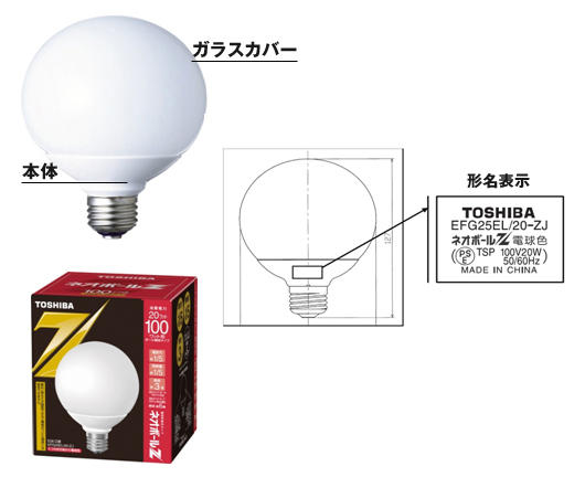 弊社が下記照明商品に採用いたしました東芝ライテック(株)製電球形蛍光灯(形名:EFG25EL/20-ZJ)において、ガラスカバーと本体の接着強度が一部弱いものがあり、電球寿命時に極めて稀に内圧が高まるとガラスカバーが破損・落下する可能性のあることが判明いたしました。
