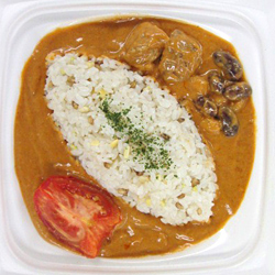 この度、ファミリーマートから発売されるカレーライスの弁当は、無印良品の「素材を生かしたカレー バターチキン」と「素材を生かしたカレー グリーン」を商品イメージとし、香辛料などを独自に調合したファミリーマートオリジナルのルーを使用するとともに、弊社が展開する飲食事業「Café&Meal MUJI※」で提供しているメニューをイメージして、十六雑穀を配合したライスを使用しています。また、焼きトマトやパプリカなどの野菜をトッピングして、女性のお客さまがより手に取りやすいよう、彩り良く仕立てられたカレーライスです。