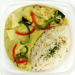 - カレーペーストを炒めて香りを出し、ココナッツミルクを加えて煮込んだタイカレーに、十六雑穀入りライスを合わせています。青唐辛子やレモングラスの風味を活かした爽快な辛さが特徴で、さつまいもやたけのこなどをトッピングしています。