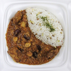 - オリジナルに配合したスパイスを使用した、鶏ひき肉、レッドキドニー、ガルバンゾー(ひよこ豆)のキーマカレーです。カレーパウダーで下味をつけて、しっかり焼いた鶏もも肉をトッピング。隠し味として、みじん切りの生姜を加えました。ライスは、「Café&Meal MUJI」で提供しているご飯をイメージして十六雑穀を配合したご飯を使用しています。※北海道、沖縄県を除く