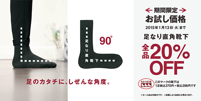 ぜひ、この機会に足のカタチに、しぜんな角度「足なり直角靴下」のはき心地をお試しください。