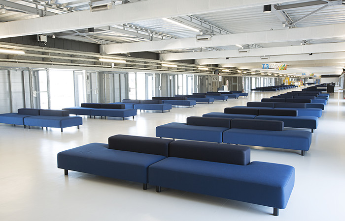 弊社では、国内空港最大のフードコートにはオーク無垢材のテーブルや椅子を設置。また、ゲートラウンジにはLCCを考え仕様を整えたソファベンチを設置しました。ソファベンチの開発では、空港にある家具を旅行者がどのように使用しているのかを観察することから始め、人々の待ち時間を快適にするデザインとは何かを追求。効率を最優先に考えたLCCでの旅の合間に人々が無意識にとる行為を考えた工夫を施しています。ゆったりと座るだけでなく閑散時には寝転ぶことも想定し、ひじ掛けをなくして座面を広く確保したデザインが特徴です。