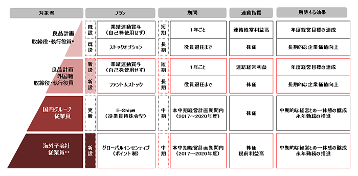 この3種類を含めた当社のインセンティブ・プランは、以下の効果を期待しており、それにより良品計画グループで働く仲間が一丸となって、中長期的な企業価値向上と中期経営計画の達成を目指す一助としたいと考えております。