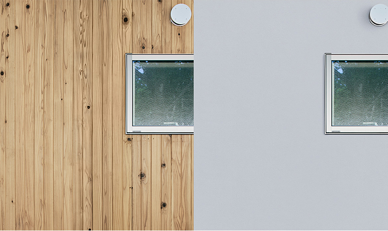 外壁には国産杉を使用した木製サイディングを標準設定。木材ならではの温かみが感じられ、その経年変化を楽しむことができます。また、オプションでつなぎ目のないオリジナル塗り壁調仕上げもお選びいただけます。