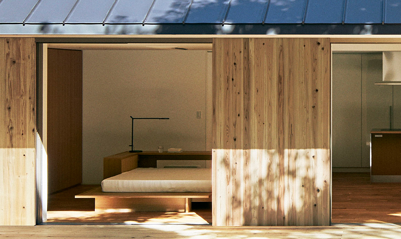住宅が密集する都市部では、2階、3階とフロアを重ねて居住スペースを拡張させていきます。そのため、いままでの無印良品の家では、吹抜けをつくり、間仕切り壁をできるだけ取り払いながら、広さや奥行きを感じる立体的なつながりをつくってきました。「陽の家」ではこれまでの無印良品の家のコンセプトを踏襲しつつ、平屋だからこそ得られる庭とのつながりを重視し、フラットで快適な居住スペースを持つ商品としています。