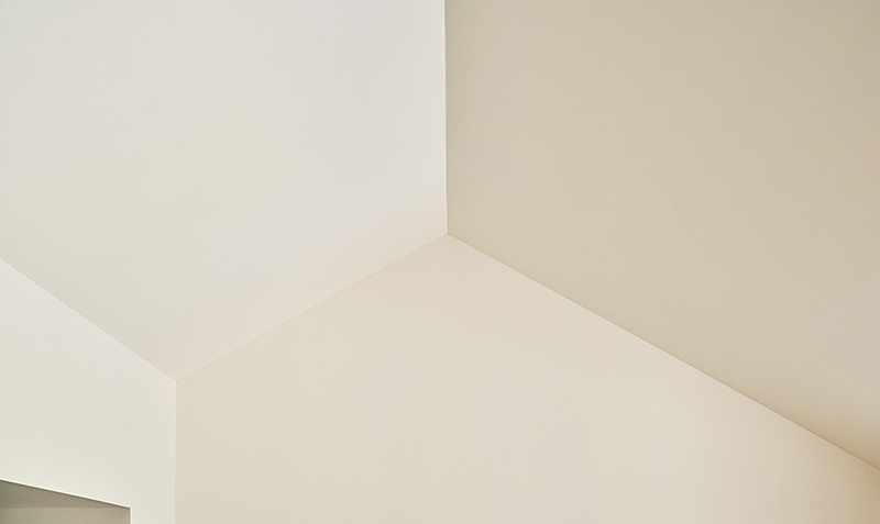リビングは建物のかたちそのままが現れる勾配天井としました。登り梁を用いて、室内に余計な構造材を見せず、平屋でありながら開放的な空間をつくっています。