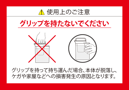 本製品を安全にご使用いただくために、持ち運びの際はグリップを持たず、取扱説明書に沿ってお使いいただきますよう、ご理解とご協力をお願い申し上げます。