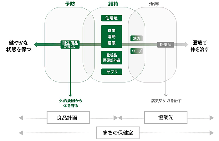 無印良品は、人と人、人と自然、人と社会をつなぐプラットフォームでありたいと考えています。高齢化やコロナ禍により、健康への関心と不安は増しています。生活者の方々の健やかな暮らしの役に立つために、日頃の生活習慣や環境を整えるきっかけを作り、自分の健康と気軽に向き合える場を目指す「まちの保健室」をはじめます。身体の状態を知ることからはじまり、外的要因から守る「予防」、心身や環境を整える「維持」、万一の際の薬の提供や健康に関する情報までをワンストップで網羅した商品・サービスを提供いたします。
