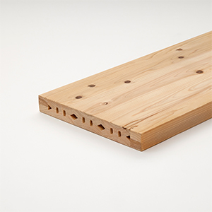 木表(きおもて)側を内側に向けて集成材にしていくことでパネル内に空洞ができ、強度がありつつも、同じ厚みの木材と比べて比較的軽いのが特徴です。宮崎県産の木材を使用しています。