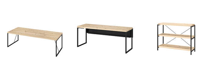 新たに2種類のパネルを追加し、産地が異なる板材を組み合わせても装着できるように再設計したスチールパーツと組み合わせて、ワークデスク、テーブル、ユニットシェルフ、ベンチとして販売します。フレームや脚をスチール製にすることで、頑丈で長く使える家具に仕立てています。