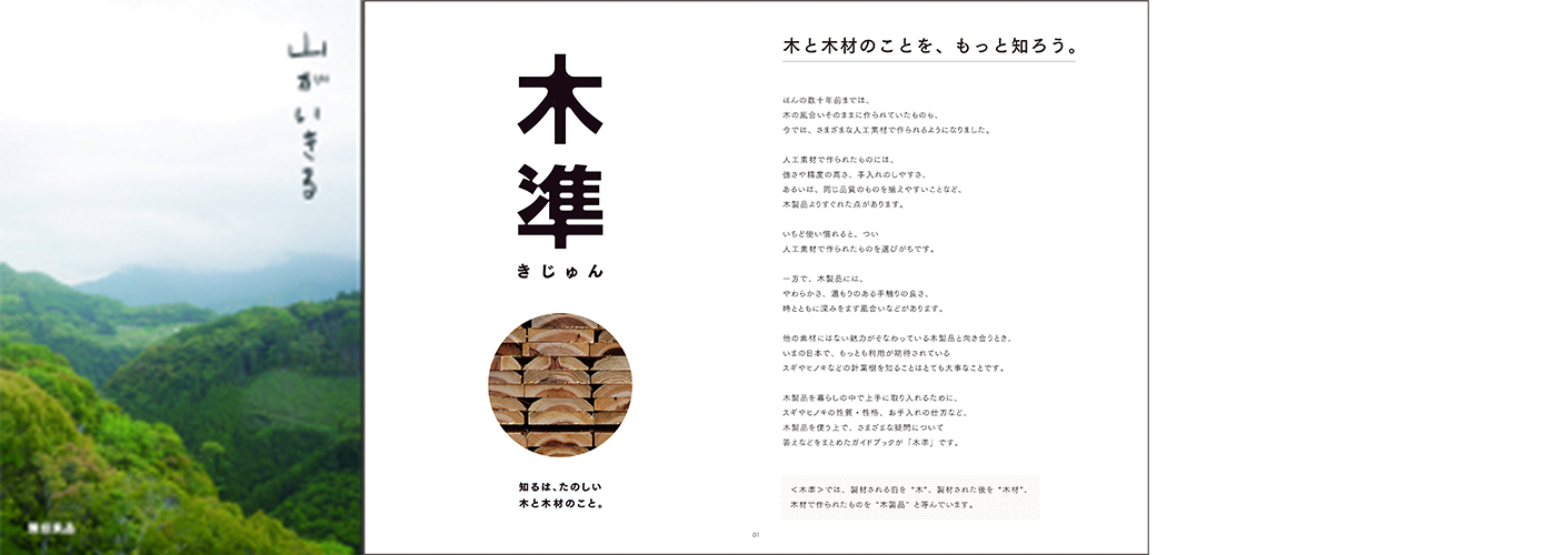 また、山と日常生活の関係や、林業を営む方々の思いや生活の様子をまとめた冊子「山がいきる」および、木材に使われる樹木の特性や木製品の取り扱いに関するガイドライン「木準」を発行し、両社のショールームや店舗に設置し、10月から啓発活動を行っていきます。