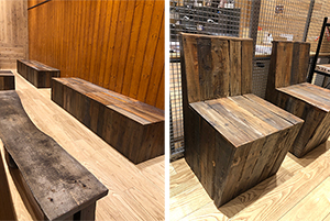 外壁や内装の木材には、北海道産の道南スギやトドマツなど使用しています。また、店内のお客様休憩スペース用ベンチやチェアは道内で解体された道内にあった建物(倉庫)の廃材を再利用しています。