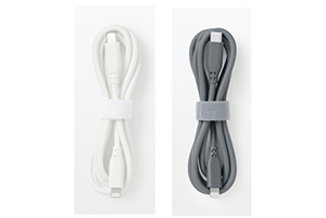 また、「やわらかくて絡まりにくいUSBケーブル」は、ケーブルをやわらかいシリコーンでコーティングし、絡まりにくく断線しにくい仕様にしました。高速データ転送が可能で、各種コネクタに対応できる品揃えです。デスクまわりやデバイスに馴染むよう、白とグレーの2色展開です。