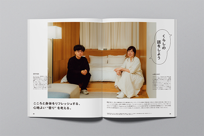 テーマを「きがる、みがる、てがる。」とし、特集では「脚付マットレス ポケットコイル」や「スチールパイプシリーズ」、「壁に付けられる家具シリーズ」など、気軽に始められて、身軽に暮らすことのできる家具類をはじめ、実際の「くらしのくふう」事例として3組のお宅の様子が紹介されています。また、新生活におすすめの「日用品図鑑」や、無印良品のプロダクトを愛用する人たちのインタビューも掲載されています。そのほか、香りにまつわる特別対談や、自然素材「カポック」を訪ねたインドネシア取材記、無印良品が行うリサイクルの取り組みなど、生活をよりイメージしやすく、気持ちよく生活するためのヒントが満載された内容で読み物としてもお楽しみいただける冊子です。