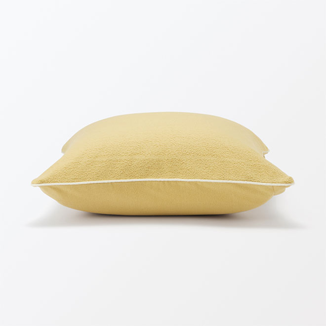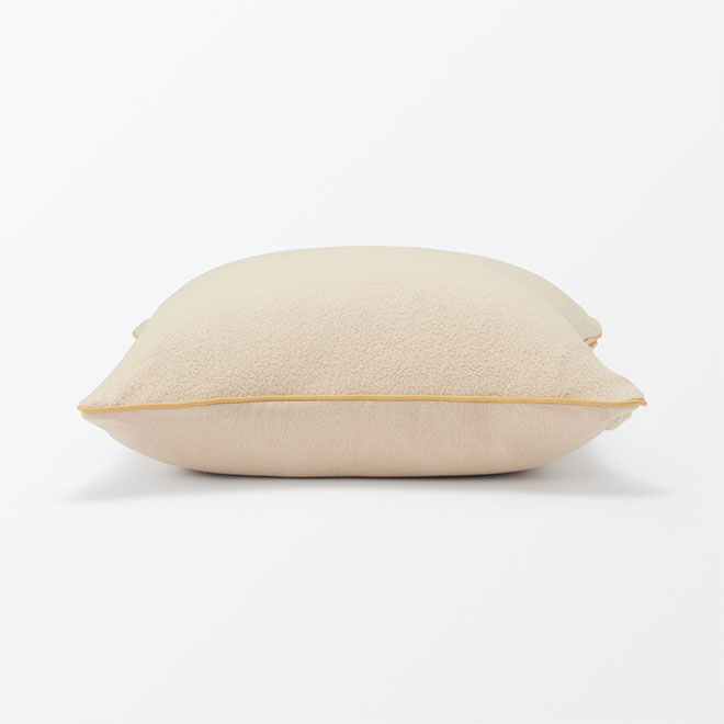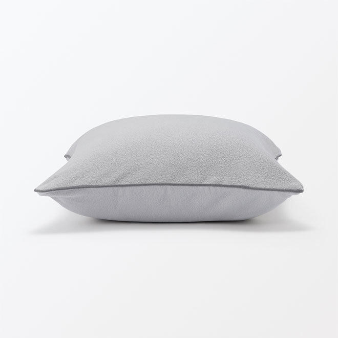 ニット地でさらりとした面と、パイルを起毛させたやわらかくあたたかみのある面のリバーシブル仕様で、異なる風合い、肌触りを楽しめるひざ掛けとクッションカバーです。お部屋のインテリアにもなじみやすい、グレー、ベージュのほか、秋冬のポイントカラーとしても楽しめるライトマスタードの3色のカラー展開にしました。肌にあたる面は綿100%で、残暑の残る時期から冬にかけて、長い季節ご使用いただけます。