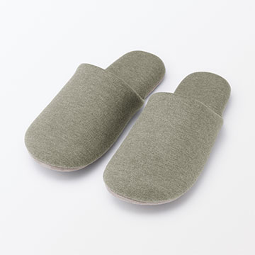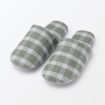 インソール部分は、凹凸のある鹿の子編み、甲に当たる部分はパイル地で、年間使いやすい素材です。底材には、歩いているときに見えても違和感がないようなスエード調の生地を使用しています。カラーは部屋なじみの良いライトベージュ、グレー、グリーンの3色展開で、季節を問わず一年中使える定番のかたちのスリッパです。